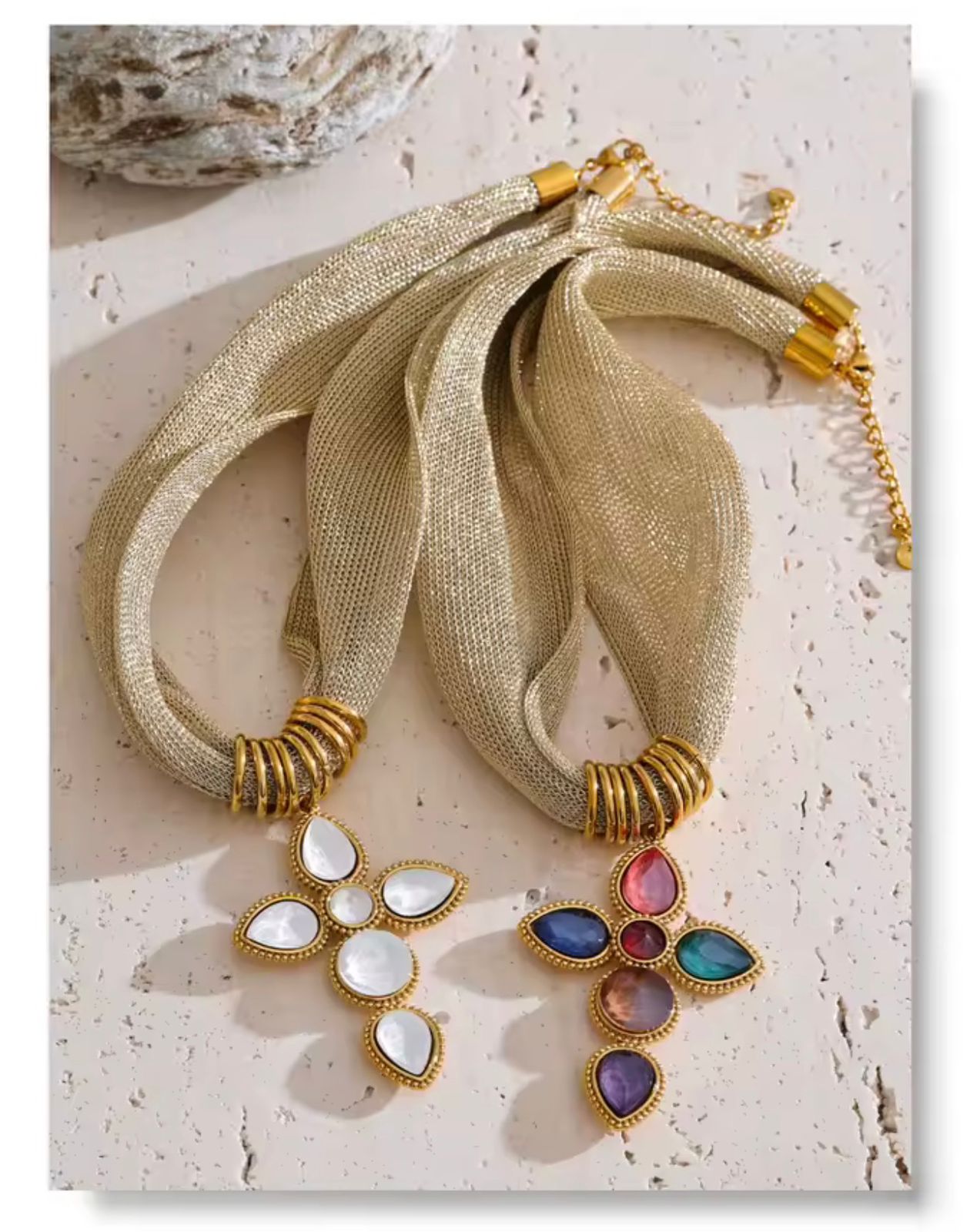 Collar de mesh y acero inoxidable con dije de cruz y piedritas, una pieza moderna con simbolismo atemporal.