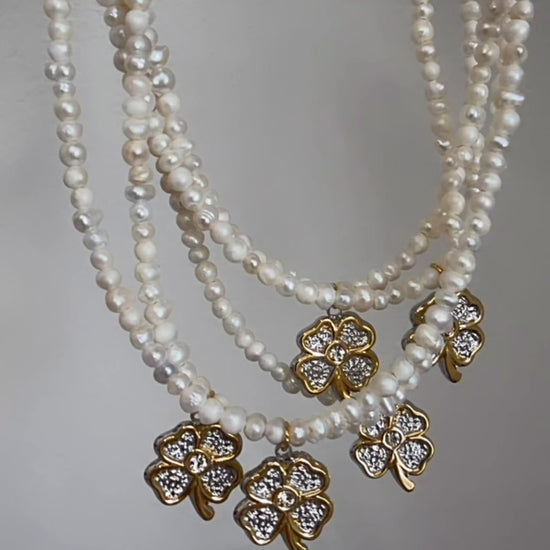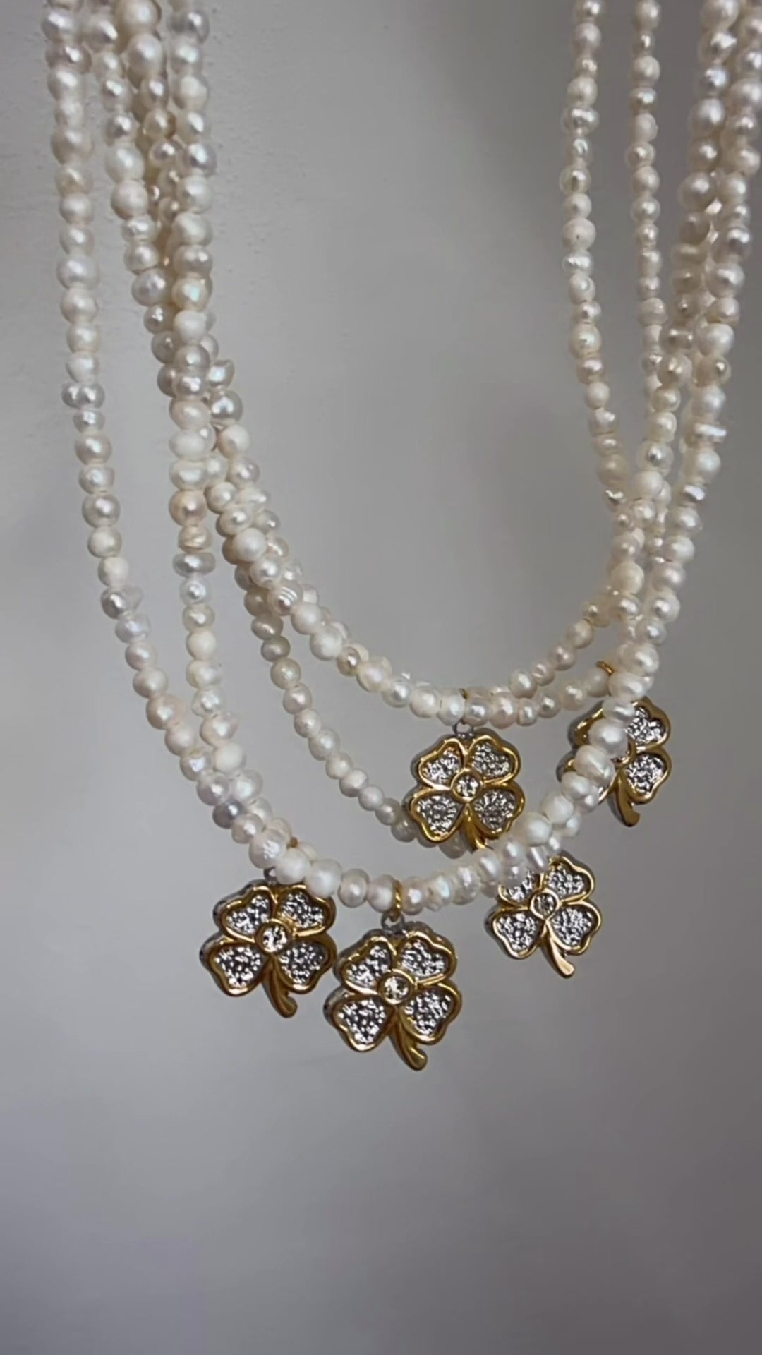 Collar de mini perlas de rio con dije en acero inoxidable bicolor y zirconia blanca central