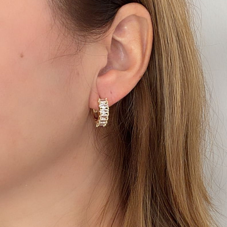 Este huggie está diseñado para brillar: un aro dorado adornado con 7 zirconias rectangulares que crean un efecto luminoso espectacular.