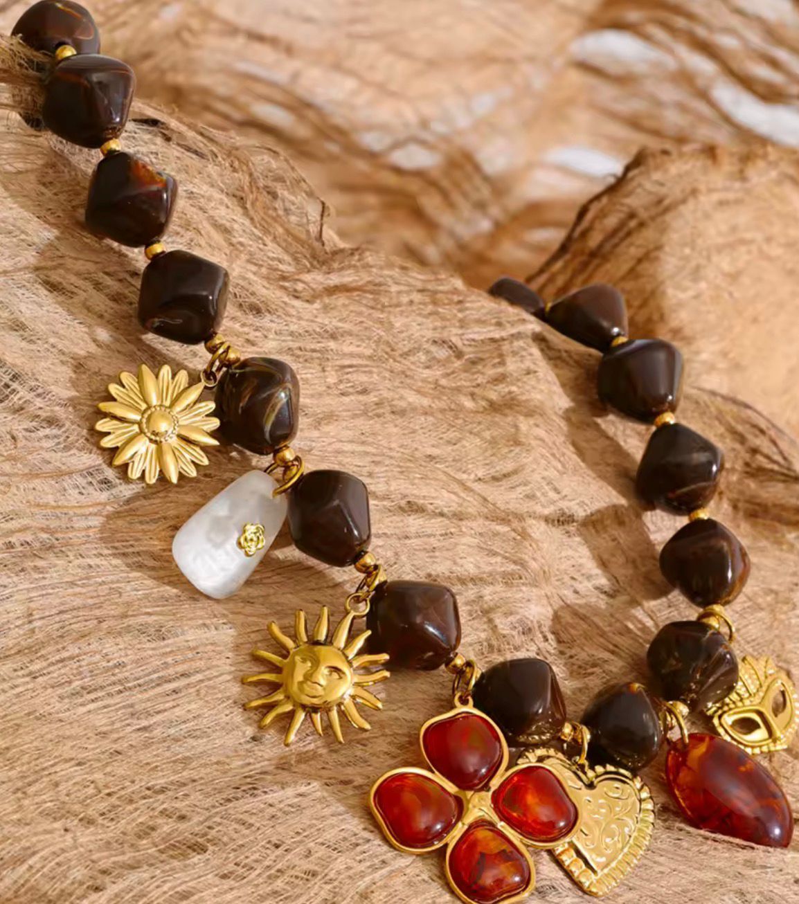 Eleva cualquier outfit con este collar statement elaborado con cuentas de resina en forma geométrica tipo rombo, que crean un diseño moderno y lleno de textura.