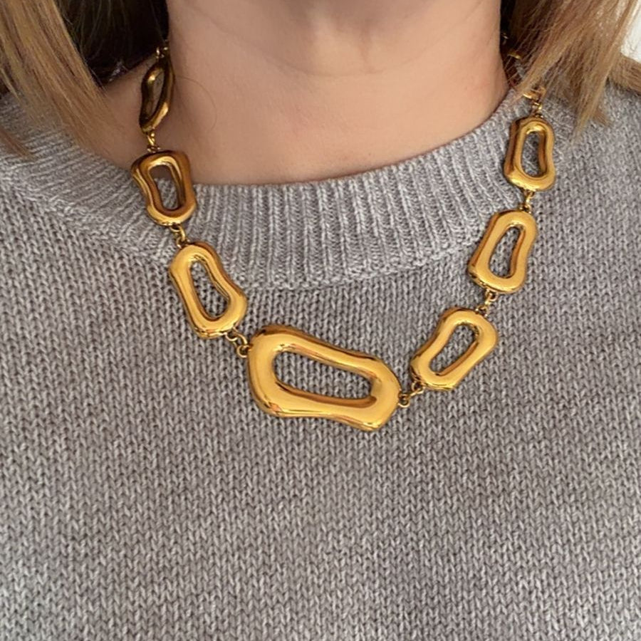 Un collar moderno y lleno de estilo, elaborado en acero inoxidable dorado con eslabones irregulares que crean un diseño único y elegante.